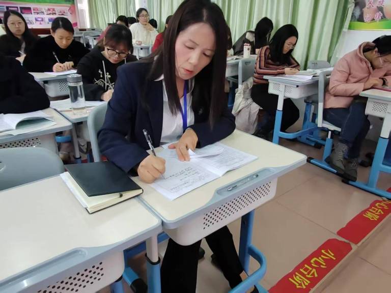 刘林玲副校长正认真记录讲课情况,对于每一位讲课的老师都会给予中肯的点评,帮助青年教师们快速成长。