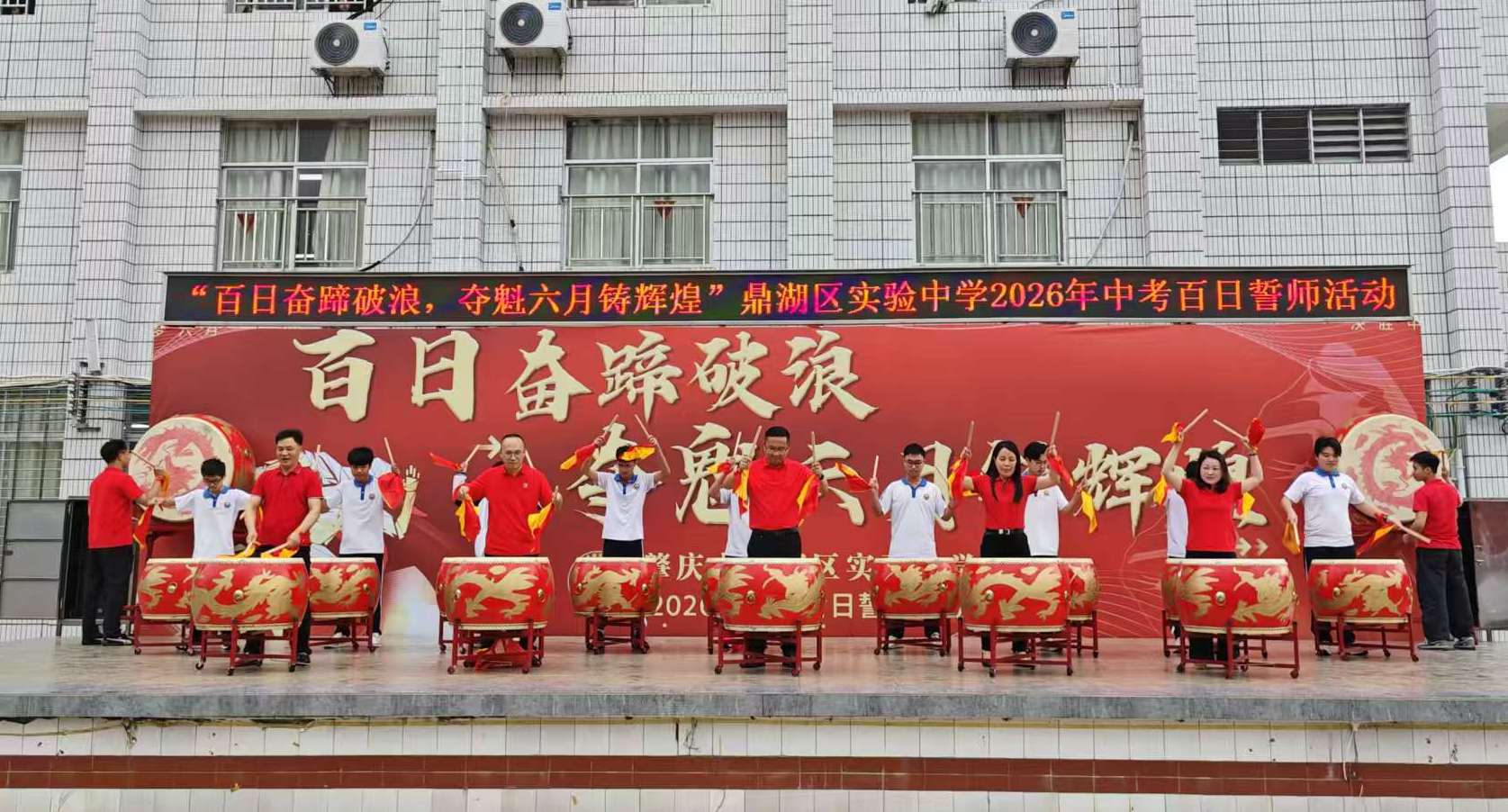 在热烈的掌声中,激昂的鼓点骤然响起,学校领导班子与来自1至9班的学生代表共同登台,手持鼓槌,合力擂响出征战鼓。鼓声如雷,震彻云霄,一声声铿锵有力的鼓点,敲出了全体师生奋战百日的坚定决心,也敲响了向中考发起最后冲锋的号角。