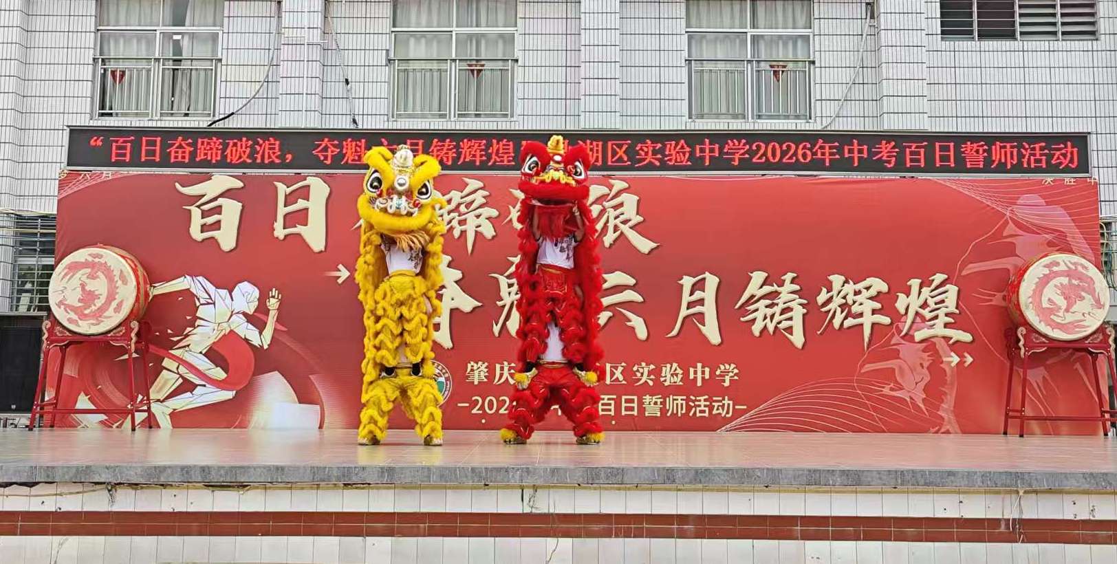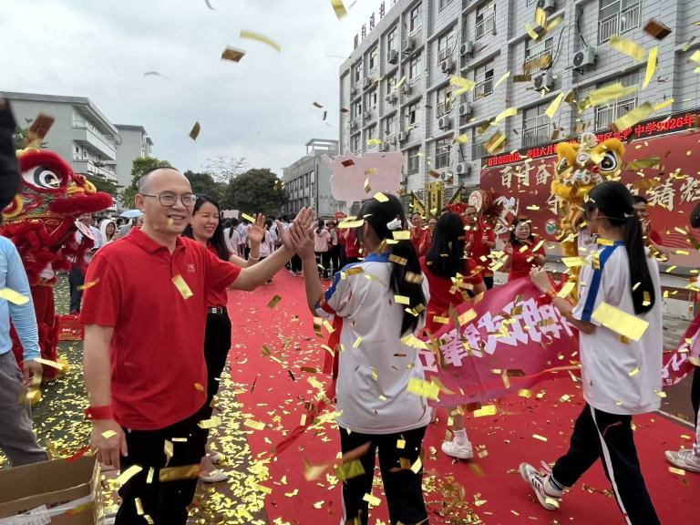 大会在激昂的醒狮表演中拉开序幕。雄狮腾跃,锣鼓喧天,瞬间点燃全场热情。随后,各班班主任带领本班学子依次跨过寓意胜利的“得胜门”,同学们步伐坚定,目光如炬,正式踏上百日冲刺的征程。